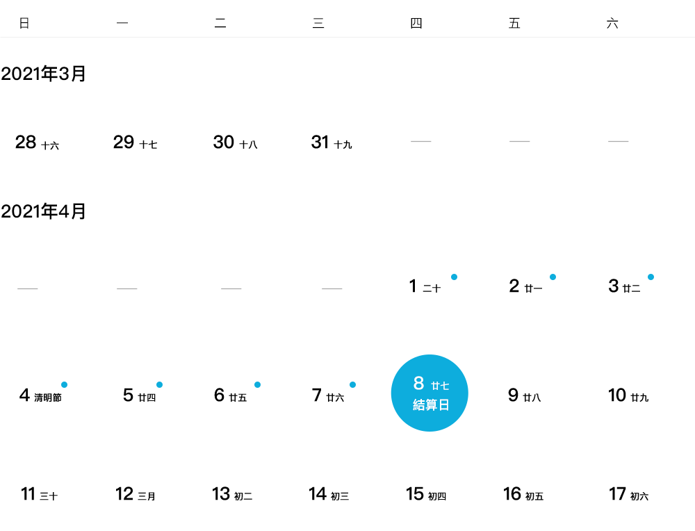 根據合作銀行及微信支付、支付寶關於復活節及清明假期的結算安排,我司對放假期間的資金結算服務將統一作如下調整: